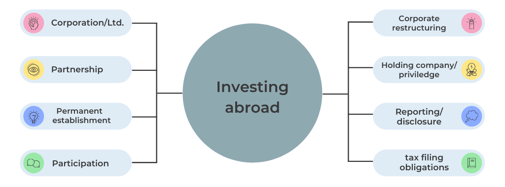 In the end we will provide a clear recommendation whether to proceed with a corporation or a partnership or with a permanent establishment. And with that we will inform you about the taxation of your funding, of profits and losses abroad and related to the investment in your own profit and loss statement and eventually about the current obligations to fulfill vis à vis the fiscal authorities in your target country.
